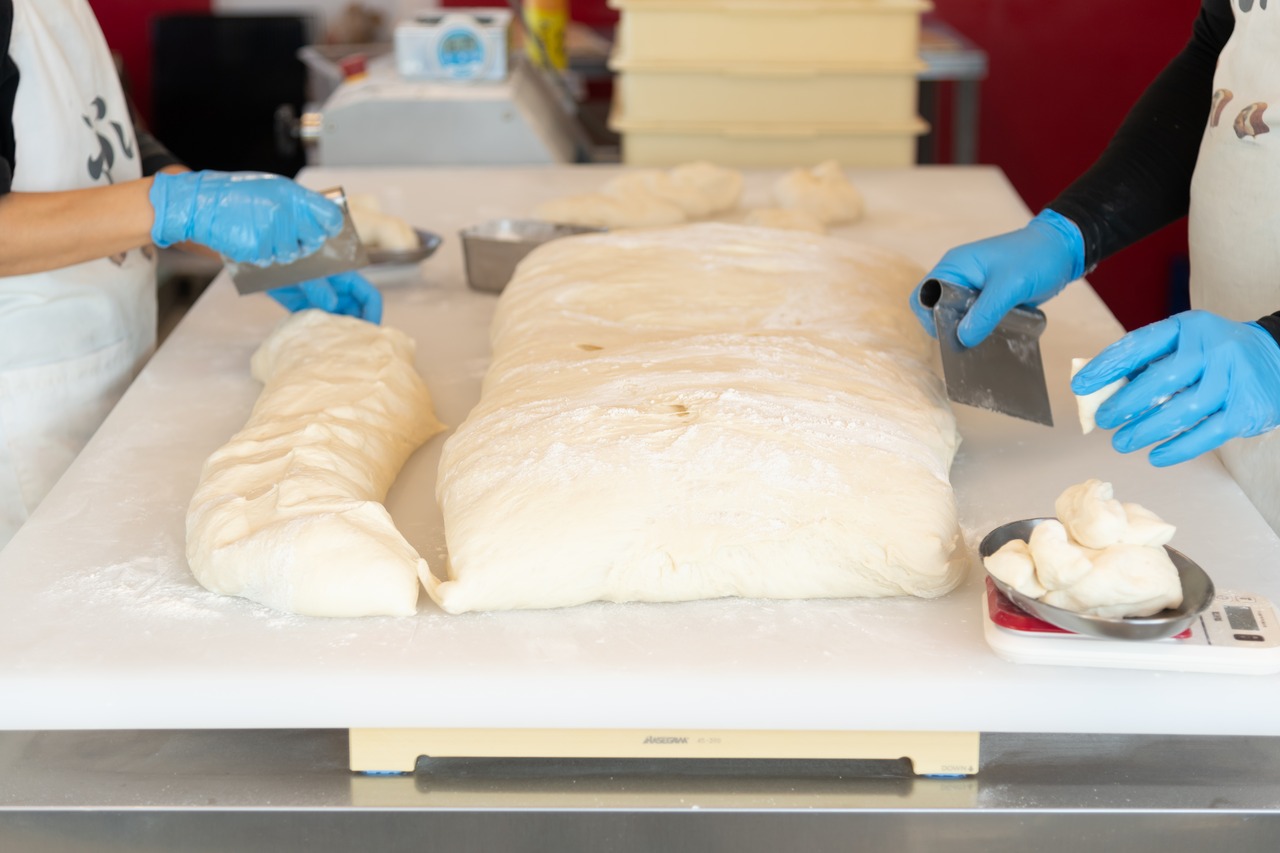 厚めのトンカツ。三元豚を低温熟成させせたものを使用し、冷めても柔らかく、ジューシーな食感が続きます。香辛料の効いたとんかつソースをたっぷりかけ、高級食パンでサンドりました。
